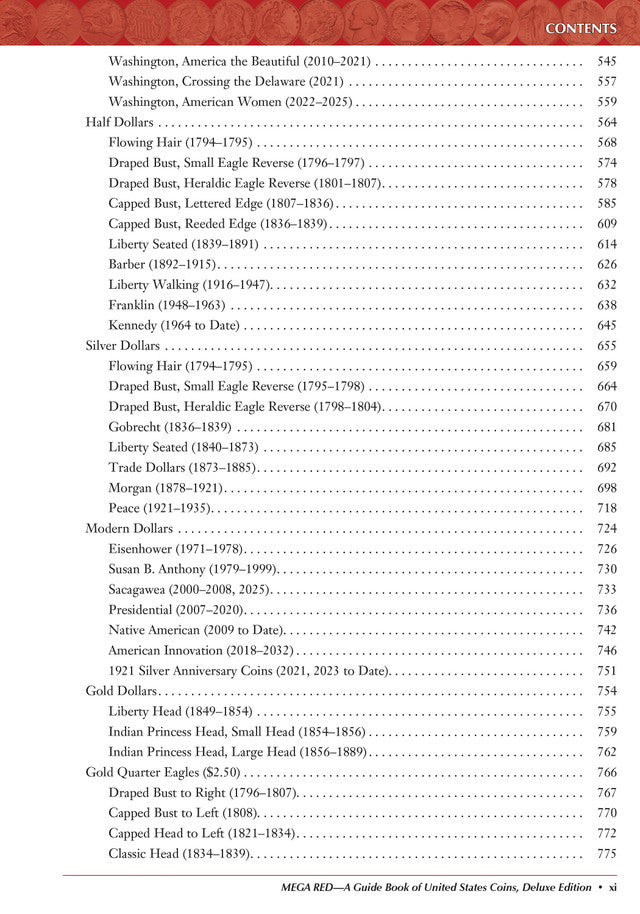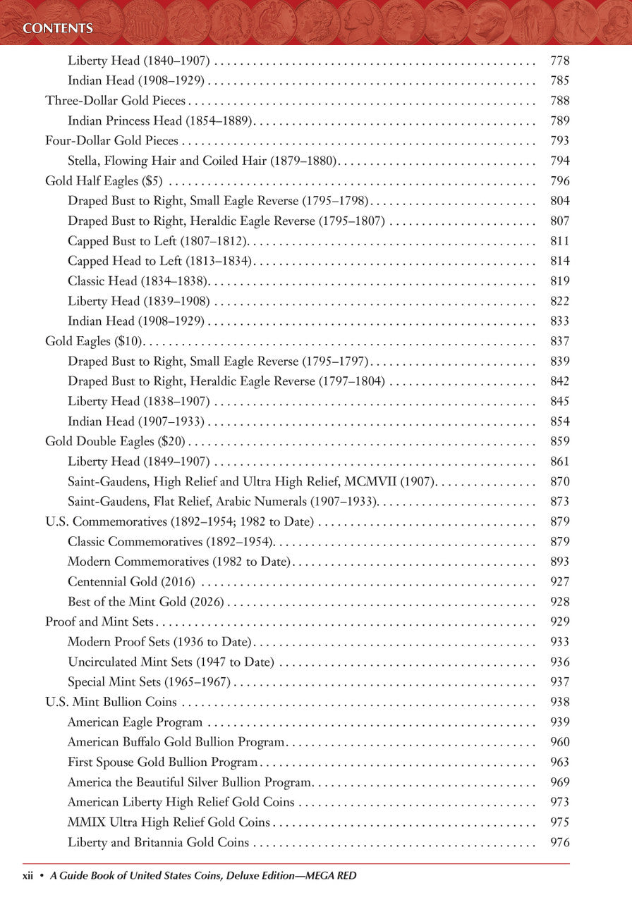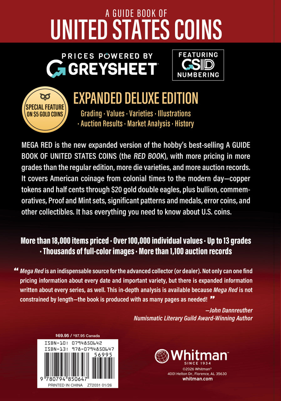 Mega Red X: A Guide Book of United States Coins Deluxe Edition is the expanded deluxe reference for U.S. coin collectors and dealers, offering deeper listings and broader pricing coverage than the standard Red Book®. The tenth edition documents American coinage from colonial issues through modern mint programs, with extensive coverage of gold, silver, bullion, commemoratives, patterns, errors, and major varieties and includes a dedicated feature exploring more than 130 years of $5 Half Eagle gold coins from 1795 through 1929.